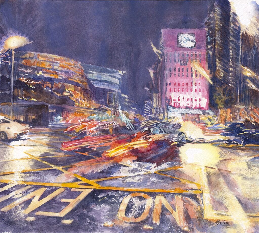 capturing the energy of the city, and it was these elements of vitality and motion which have remained an integral part of my artwork ever since. The city is never still. I feel a pulse running through it. Be it on a hot baking day in Prague, or standing by the ring road on a wet, rainy night in Birmingham, with the deafening noise of the traffic and blazing lights bouncing off the wet tarmac, it all inspires me and makes me feel alive.