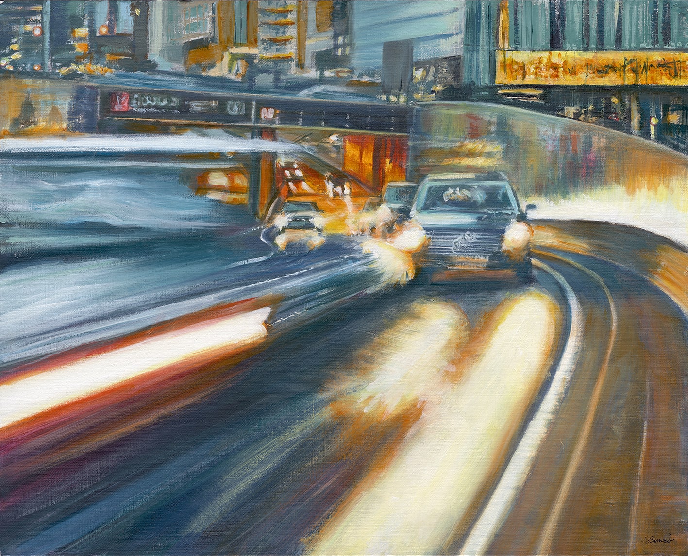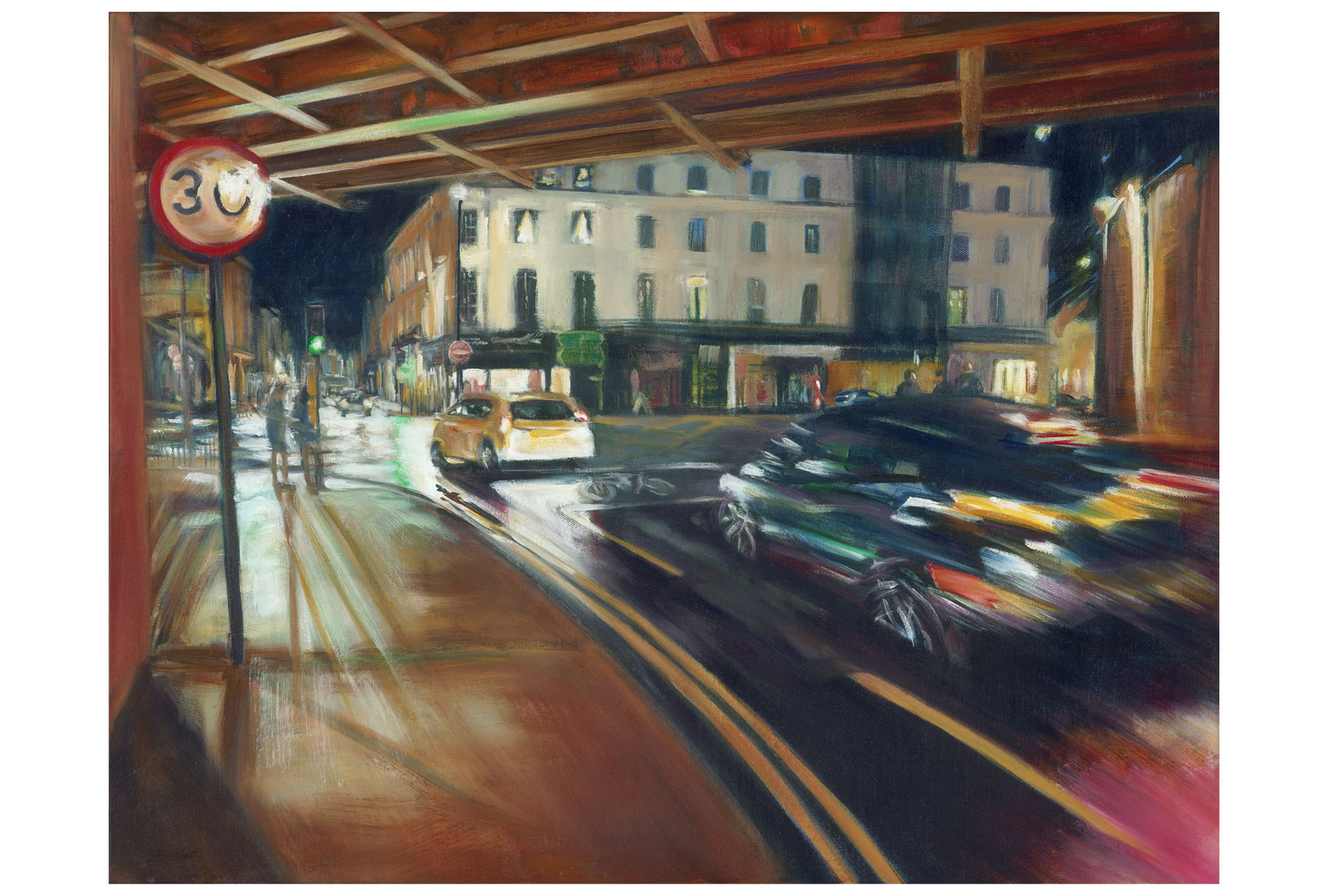 My photography is a very important starting point and stimulus. Especially for my night shots, where it is far too dangerous to just sit and sketch. I typically use settings which are in the realms of slow motion, which gives me very unexpected results, usually what the eye can’t see. But my photographs are rarely the end results, as I feel the need to rearrange compositions, amalgamate images together, immerse myself in painting so I can add layers and texture, let the paint speak and evolve the scale of the final pieces.